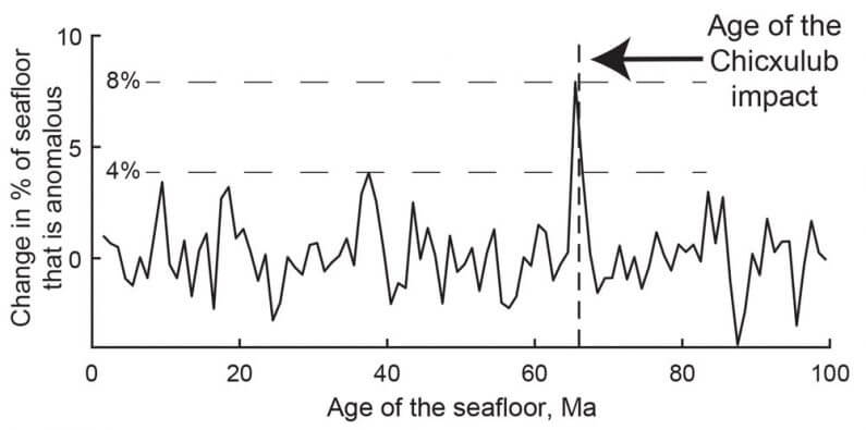 The total volume of excess material is difficult to pin down, because a large amount of magma could have been injected into the lower crust where it would have a weaker gravitational signature. But we estimate that around the time of the Chicxulub impact, on the order of 23,000 to 230,000 cubic miles of magma erupted out of the mid-ocean ridges, all over the globe. This is on par with the largest eruptive events in Earth’s 4.5-billion-year history, including the Deccan Traps.