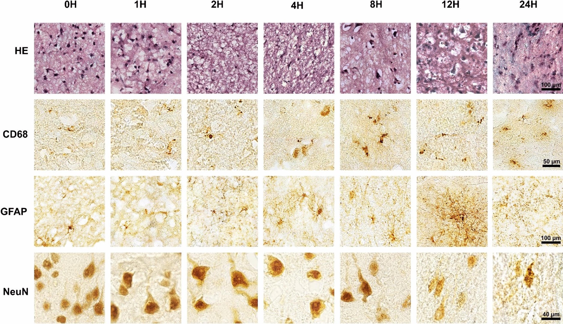 By four hours after death, most neurons were swollen; by 12 hours nuclear details were disappearing; by 24 hours most neurons were degraded. But microglia increased their activity in two hours; some astroglia which had remained quiet, upped their activity only after four hours but gave up the ghost after 24 hours.